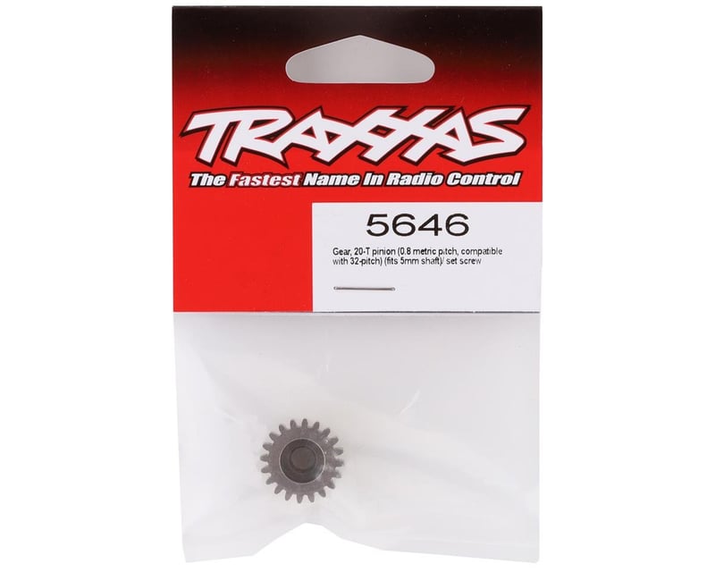 20-tooth pinion gear (32-pitch) fits 5 mm motor shafts and includes set screw. Traxxas pinion gears let you fine-tune the performance of your Traxxas model. Changing gear ratios can help balance acceleration and top speed for different running conditions.