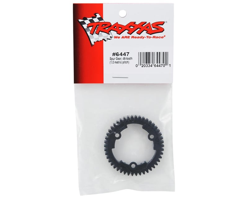 46-tooth spur gear (1.0 metric pitch). Traxxas spur gears let you fine-tune the performance of your Traxxas model. Changing gear ratios can help balance acceleration and top speed for different running conditions. Please consult your owner’s manual for mo