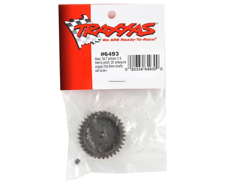 34-tooth pinion gear (1.0 metric pitch) fits 5 mm motor shafts and includes set screw. Traxxas pinion gears let you fine-tune the performance of your Traxxas model. Changing gear ratios can help balance acceleration and top speed for different running con